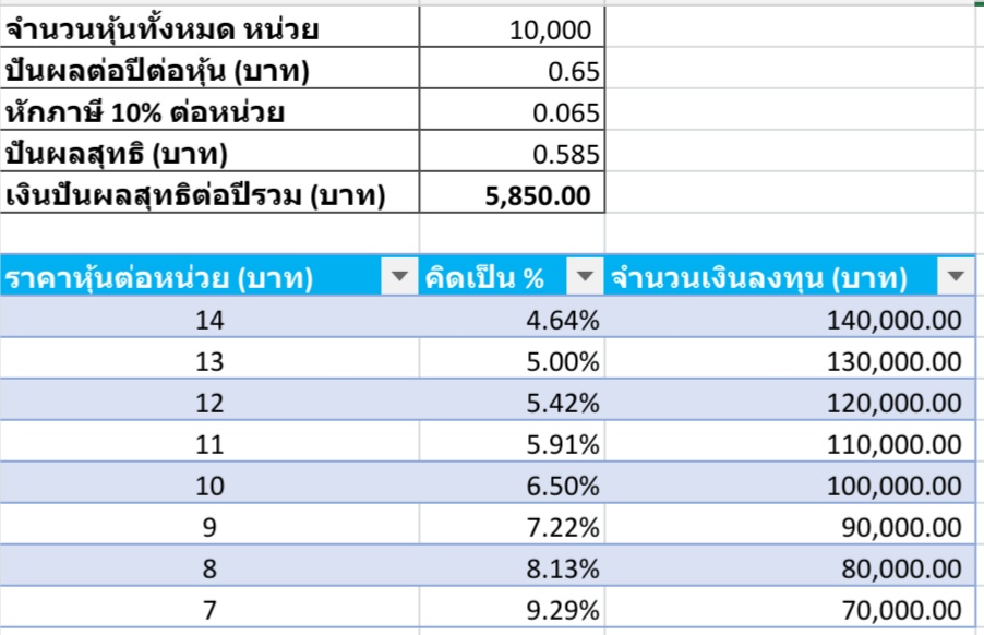 ได้ยินกันบ่อยในสภาวะดอกเบี้ยเงินฝากแสนถูก เรียกว่า 1% กว่าๆก็เป็นดอกเบี้ยโปรแล้ว เงินหนึ่งแสนบาทฝากหนึ่งปีได้ผลตอบแทนแค่ 1,000 บาทก็เก่งแล้วแถมโดนหักภาษีอีก 15% จะเหลือแค่ 850 บาทถ้วนๆ น่าเศร้าใจจริง ลองหันมาดูตลาดหุ้นก็ไม่กล้าจะลงทุนเพราะหุ้นขึ้นลงใจตุ้มใจต่ำ หุ้นไม่ได้ปลอดภัยเหมือนเงินฝาก แต่ก็มีแนวคิดการลงทุนแบบเก็บปันผลที่พอจะสร้างความมั่นใจด้วยผลตอบแทนที่ดีกว่าดอกเบี้ยแน่นอน แต่ต้องมีความอดทนรอ รอๆๆๆ จนกว่าได้ราคาที่เหมาะสมที่จะทำให้เราลงทุนแล้วได้ผลตอบแทนสมกับความเสี่ยงที่มากกว่าเงินฝาก
