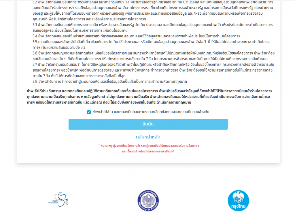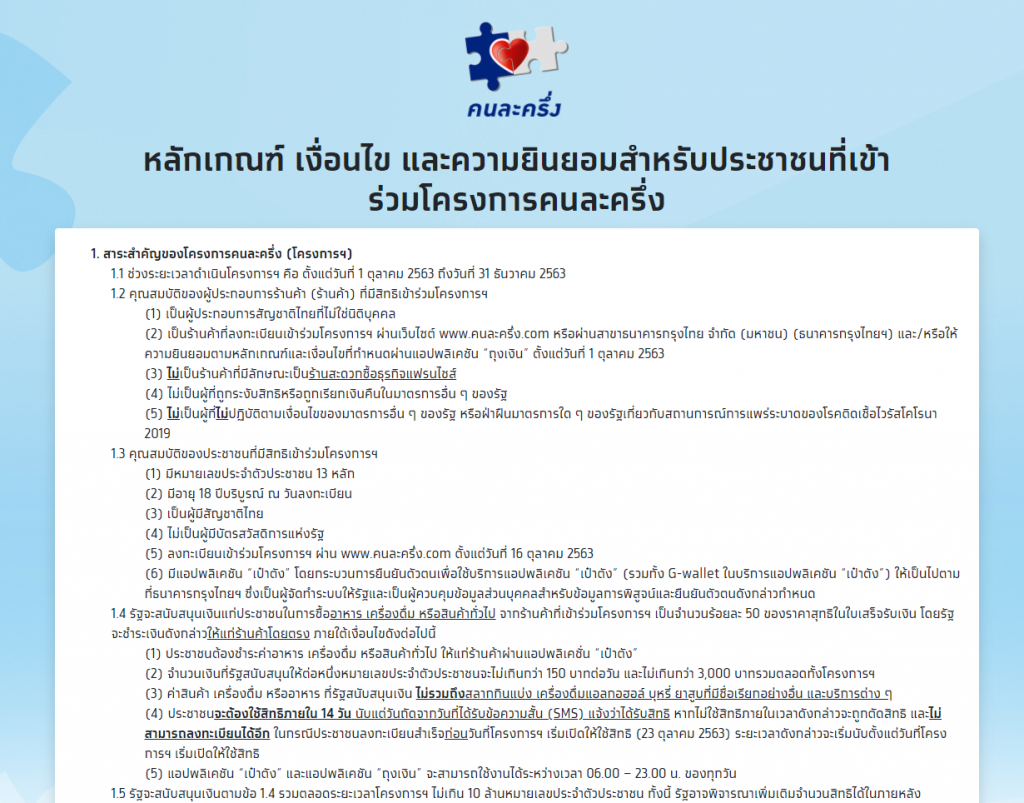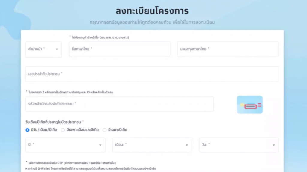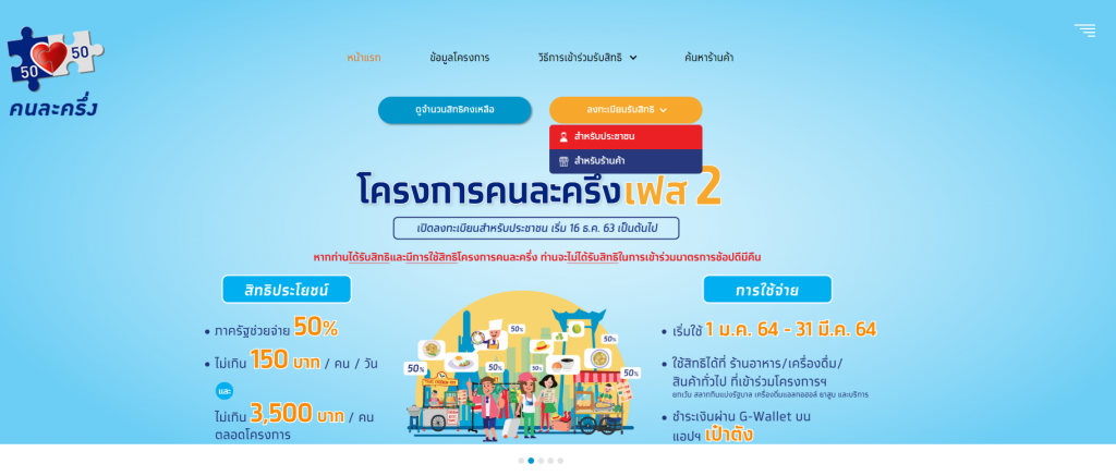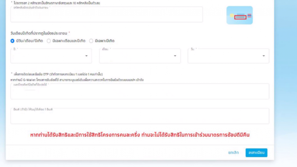 1. ลงทะเบียนผ่านเว็บไซต์ www.คนละครึ่ง.com โดยเตรียมกรอกข้อมูลชื่อ – สกุล เลขบัตรประจำตัวประชาชน รหัสหลังบัตรประจำตัวประชาชน วันเดือนปีเกิด และเบอร์โทรศัพท์ที่จะติดตั้งแอปพลิเคชัน “เป๋าตัง” (ขั้นตอนนี้สำคัญที่สุด)