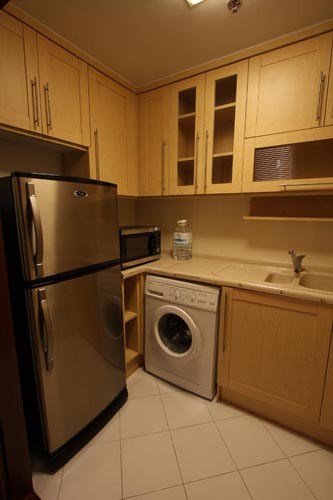 คอนโดหรูริมแม่น้ำเจ้าพระยา ตกแต่งพร้อมอยู่ พร้อมด้วยเครื่องใช้ไฟฟ้า เช่น ตู้เย็น เครื่องซักผ้า ไมโครเวฟ และ เตาไฟฟ้าพร้อมฮู๊ดดูดควัน
