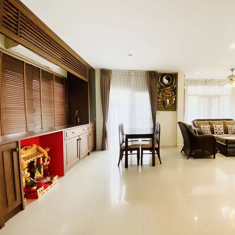 สัมผัสชีวิตท่ามกลางธรรมชาติอันสวยงามแบบรีสอร์ต กับบ้านเดี่ยวสไตล์ Modern Retreat ที่กว้างขวาง โปร่งสบาย บ้านตั้งอยู่ในซอยแรกของโครงการ ซึ่งมีเพียง 3 หลัง ไม่มีบ้านฝั่งตรงข้าม บรรยากาศเงียบสงบ ร่มรื่น ให้ความเป็นส่วนตัวสูง เหมาะสำหรับเป็นที่อยู่อาศัย ภายในตกแต่งด้วยเฟอร์นิเจอร์บิวท์อินไม้สักเกือบทั้งหลัง พื้นรอบบ้านปูด้วยไม้เฌอร่า ตัวบ้านได้รับการดูแลรักษาอย่างดีเป็นประจำ เจ้าของอยู่เอง ไม่เคยปล่อยเช่า และได้เชิญซินแสมาปรับฮวงจุ้ยบ้านแล้ว -บ้านเดี่ยว 2 ชั้น